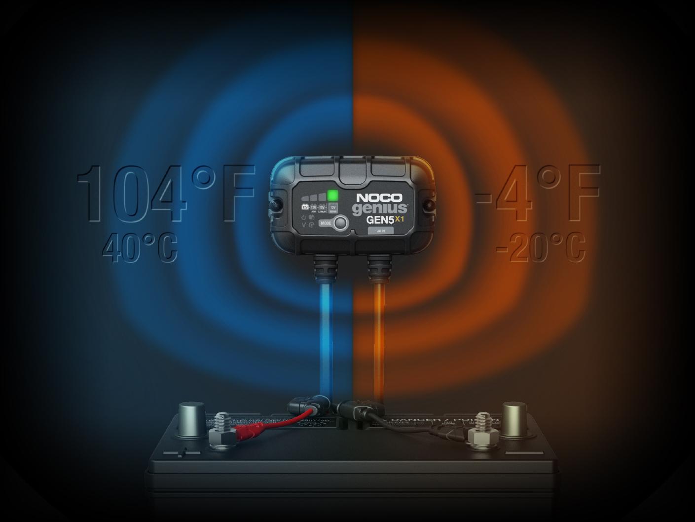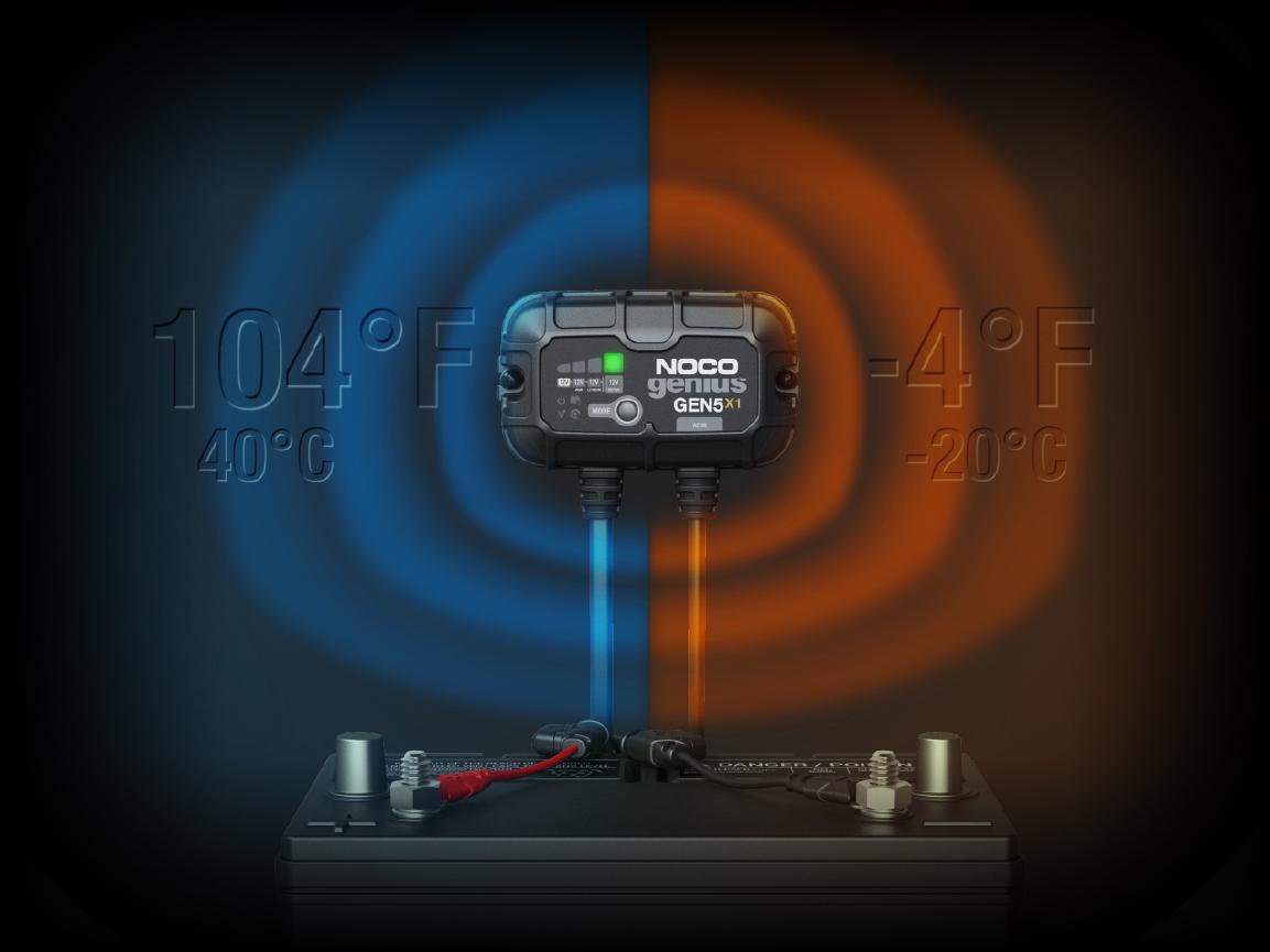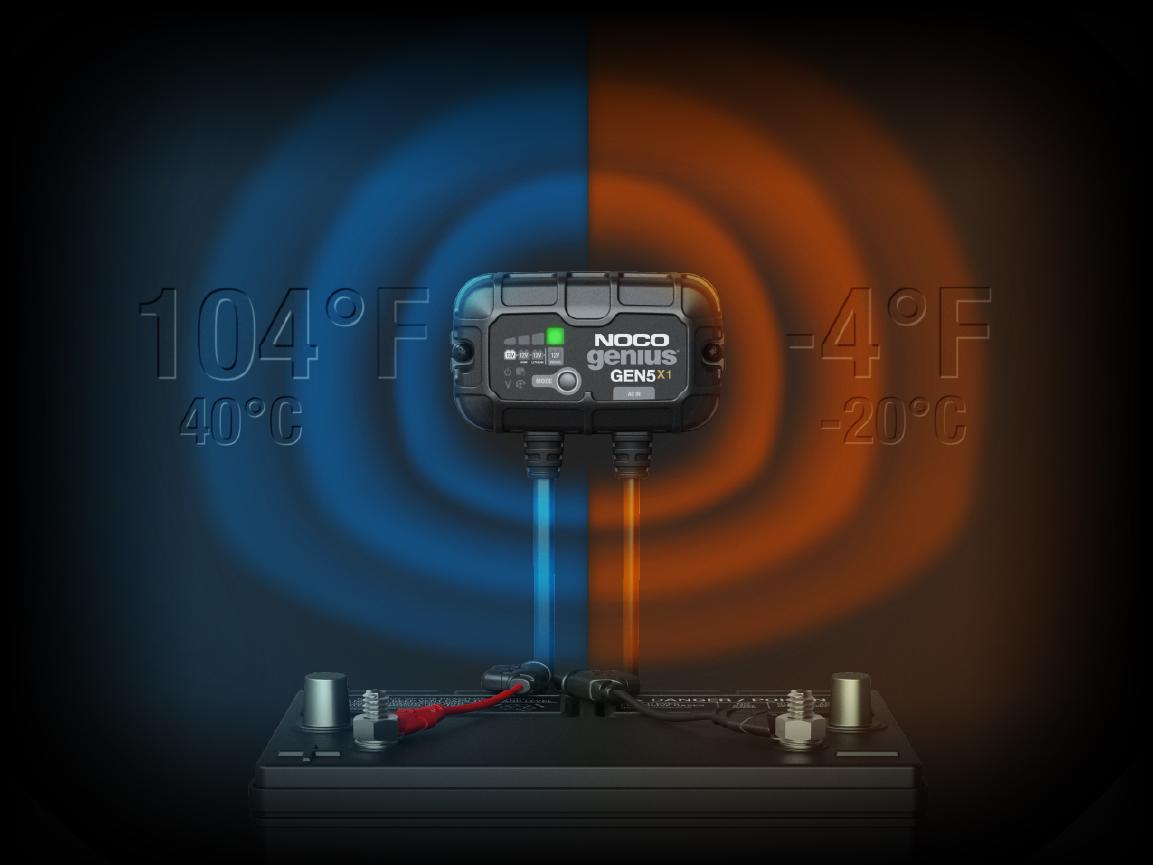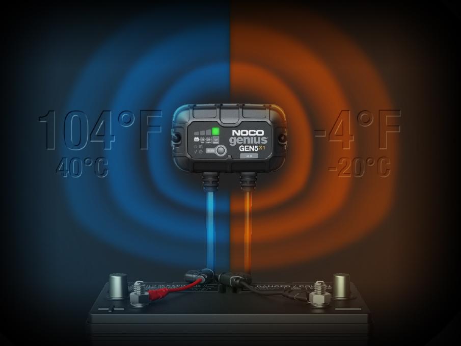 The new integrated thermal sensor automatically monitors and adjusts the charging cycle based on fluctuations of ambient temperature, limiting the chance of under-charging or over-charging, providing a more accurate and fully charged battery. Avoids under-charging in cold weather down to -4F and avoids over-charging in hot weather up to 104F.