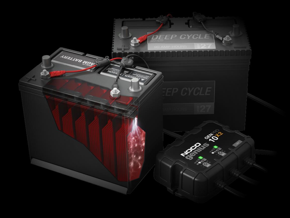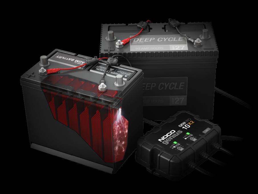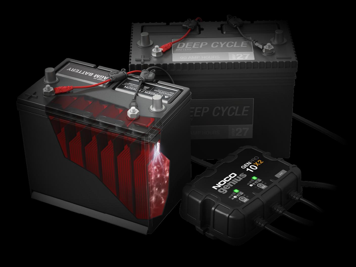 Meet the all-new GENPRO10X2. Similar to our GEN2, only better. It's 19% smaller and delivers 33% more power. It's one of the best performing onboard marine battery chargers we have ever made. A two-bank onboard battery charger rated at 20-amps (10-amps per bank) for 12-volt batteries, including marine, boat, starter, and deep-cycle batteries. Independently charge and control each battery bank with selectable charging modes - including 12V, 12V AGM, 12V Lithium, and 12V Repair Mode - for all types of lead-acid and lithium-ion batteries.